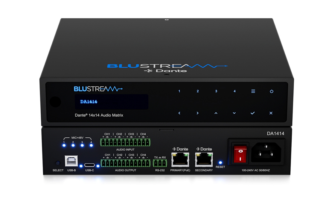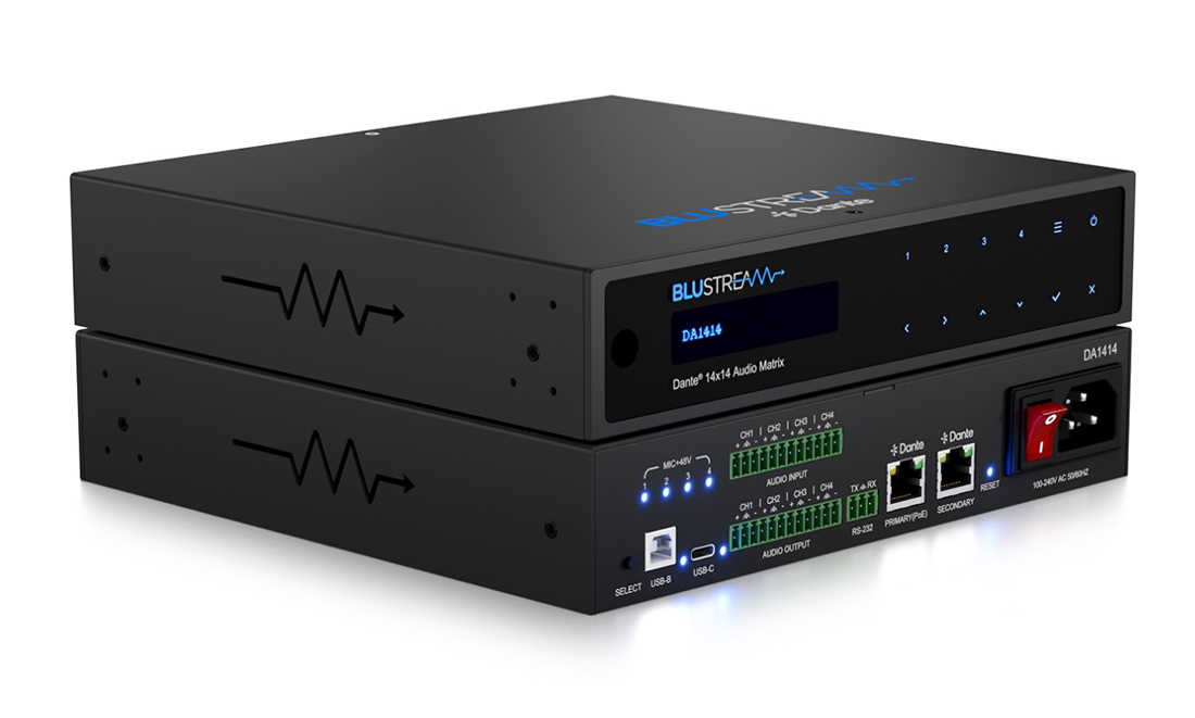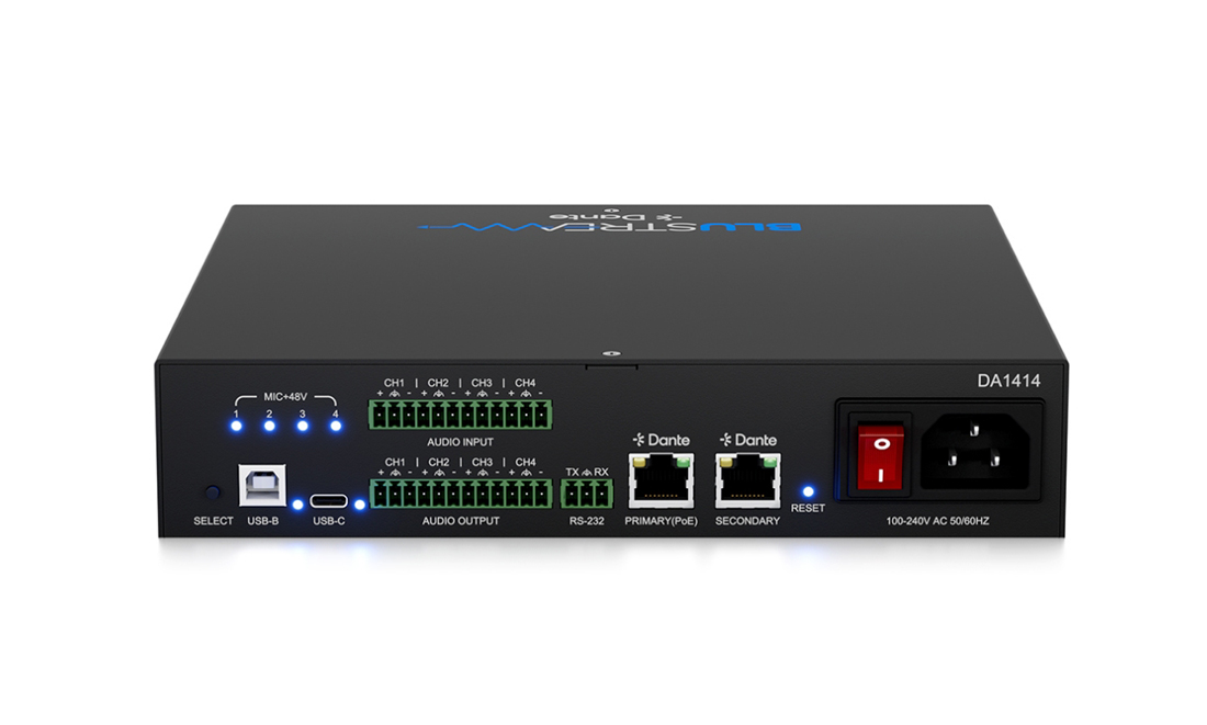 DA1414 je vybavená 8 Dante, 4 symetrickými / nesymetrickými analógovými a 2 USB audio vstupmi a podporuje výstup na 8 Dante, 4 symetrické/nesymetrické analógové a 2 USB kanály. Systém obsahuje funkciu prepínania API, ktorá umožňuje používateľom smerovať Dante kanály prostredníctvom platforiem tretích strán, čím sa obchádza Dante Controller alebo Domain Manager. Analógové vstupy majú tiež voliteľné 48V fantomové napájanie pre mikrofónové alebo linkové pripojenia. Možnosti pripojenia USB-C / USB-B navyše zabezpečujú maximálnu flexibilitu a vyhovujú rôznym systémovým návrhom. DA1414 ponúka pokročilé a zároveň cenovo výhodné riešenie pre bezproblémové smerovanie a ovládanie audio signálov v komerčnom aj rezidenčnom prostredí bez ohľadu na typ zdroja.