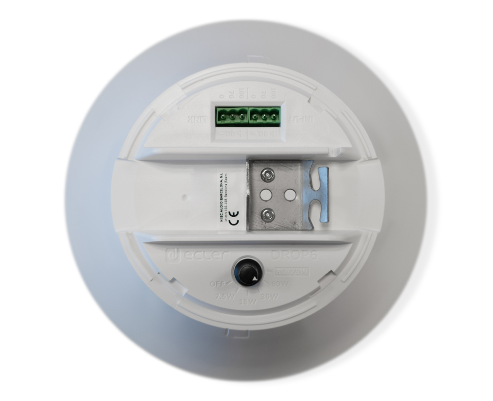 DROP6 je 6,5" 2-pásmový závesný reproduktor s elegantným dizajnom, ktorý je vybavený linkovým transformátorom 70/100V s možnosťami výberu výkonu 60/30/15 a 7,5W, dostupný s vysokou a nízkou impedanciou.