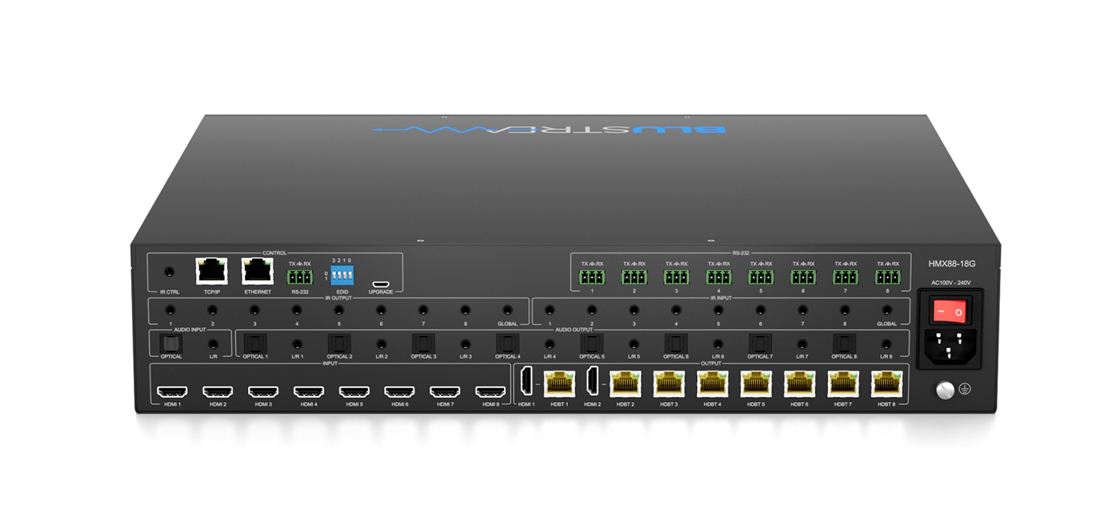 Matrix tiež poskytuje pokročilé funkcie vrátane paralelného HDBaseT™ a HDMI na výstupoch 1 a 2, inteligentného škálovania videa na výstupoch HDBaseT™ a nezávislého audio matrixu 26x8 s ARC a optickým audio spätným signálom. HMX88-18G obsahuje vstavaný modul rozhrania webového prehliadača a RS-232 pre ovládanie a konfiguráciu matrixu a priechodzí IR a Ethernet pre bezproblémovú integráciu ovládania tretích strán.
