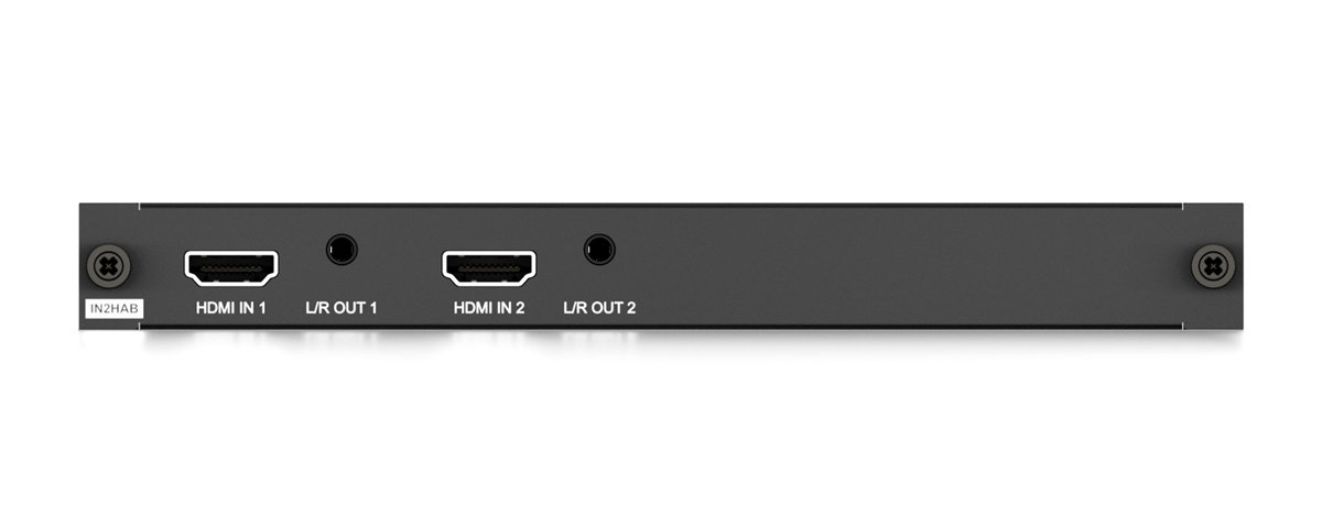 Doska PRO-IN2HAB obsahuje 2 vstupy HDMI 2.0 s podporou 4K 60Hz 4:4:4, ktoré je možné nezávisle smerovať k ľubovoľnej výstupnej doske HDMI / HDBaseT™. Každý vstup HDMI obsahuje nezávislý 2 kanálový analógový audio rozbočovač s pevnou úrovňou a je vybavený rýchloupínacími úchytmi pre moduly kariet, ktoré umožňujú jednoduchú inštaláciu do rozbočovača Custom Pro Matrix.