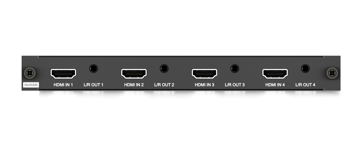 Doska PRO-IN4HAB obsahuje 4 vstupy HDMI 2.0 s podporou 4K 60Hz 4:4:4, ktoré je možné nezávisle smerovať k ľubovoľnej výstupnej doske HDMI / HDBaseT™. Každý vstup HDMI obsahuje nezávislý 2 kanálový analógový audio rozbočovač s pevnou úrovňou a je vybavený rýchloupínacími úchytmi pre moduly kariet, ktoré umožňujú jednoduchú inštaláciu do rozbočovača Custom Pro Matrix.