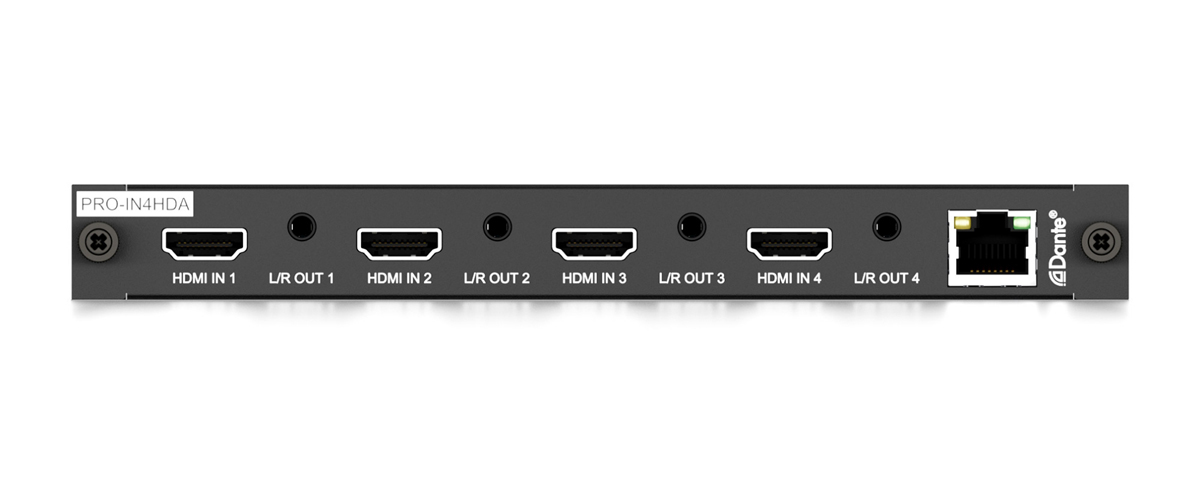 Doska PRO-IN4HDA obsahuje 4x HDMI 2.0 vstupy s podporou 4K 60Hz 4:4:4, ktoré je možné nezávisle smerovať k ľubovoľnej výstupnej doske HDMI/HDBaseT. Každý HDMI vstup obsahuje nezávislý 2-kanálový Dante audio breakout, 2-kanálový analógový audio breakout s pevnou úrovňou a 4x 2-kanálové Dante audio vstupy, ktoré umožňujú embedding zvuku do zdroja HDMI. PROIN4HDA je vybavená rýchloupínacími úchytmi pre moduly kariet, ktoré umožňujú jednoduchú inštaláciu do rozbočovača Custom Pro Matrix.