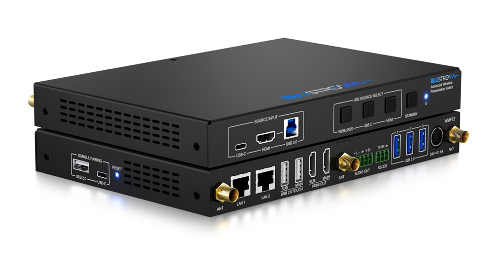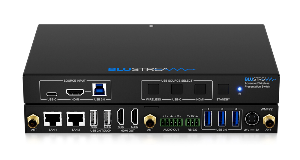 WMF72 tiež ponúka ovládanie OSD, USB kameru a mikrofón cez WiFi, USB touchback k pripojenému hostiteľskému zariadeniu, anotácie na bielej tabuli a obrazovke, manuálny alebo automatický výber zdroja a ovládanie cez predný panel, RS-232 a TCP/IP. WMF72 je tiež kompatibilný s bezdrôtovými plug & play adaptérmi Blustream WMF-USBC-D a WMF-HDMI-D, čím poskytuje ideálne riešenie BYOD pre vašu zasadaciu miestnosť, učebňu alebo malé miestnosti.